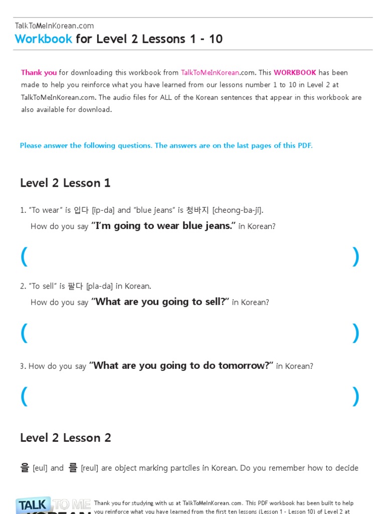 Multiple choice This workbook is designed to be used in conjunction with the Talk To Me In Korean. Learn Korean with our systematic curriculum professional teachers over 1500 bite-sized online lessons and beautiful books shipped worldwide. Please feel free to share TalkToMeInKoreans free.
